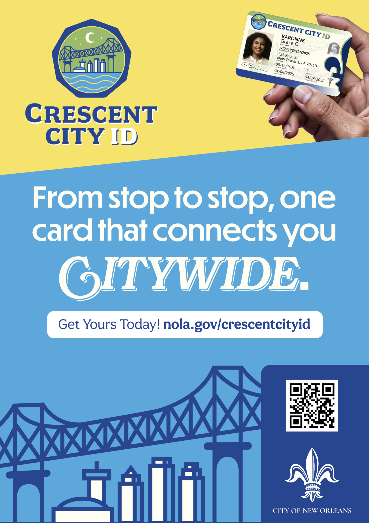 We led the full brand development, launch, and multi-platform marketing rollout for the City of New Orleans’ new municipal ID program: Crescent City ID.